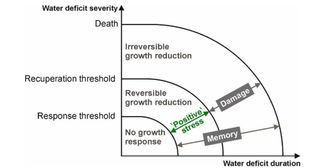 {7}Water deprivation for trees is a form of disturbance, and Kögler and Söffker have defined several levels of stress based on the intensity and the duration of a hydric deficit [F. Kögler and D. Söffker, 2020] (Figure 1). A stress can be positive for the tree up to a certain threshold, but after a limit, it becomes harmful and can cause death. This threshold is a tipping point, a boundary between two states; the hill’s height for the rolling ball. This example was presented to the two artists of the present project, who perceived this threshold as a pertinent orientation to follow for the production of the dynamic visualizations, to be discussed further on.